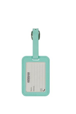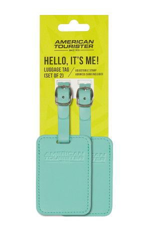 American Touristerin logolla varustettu osoitelappu matkalaukun-tai repun nimikointiin. Paketissa on kaksi samanlaista mintunvihreää osoitelappua.