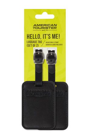 Musta, American Touristerin logolla varustettu osoitelappu matkalaukun-tai repun nimikointiin. Paketissa on kaksi samanlaista osoitelappua.