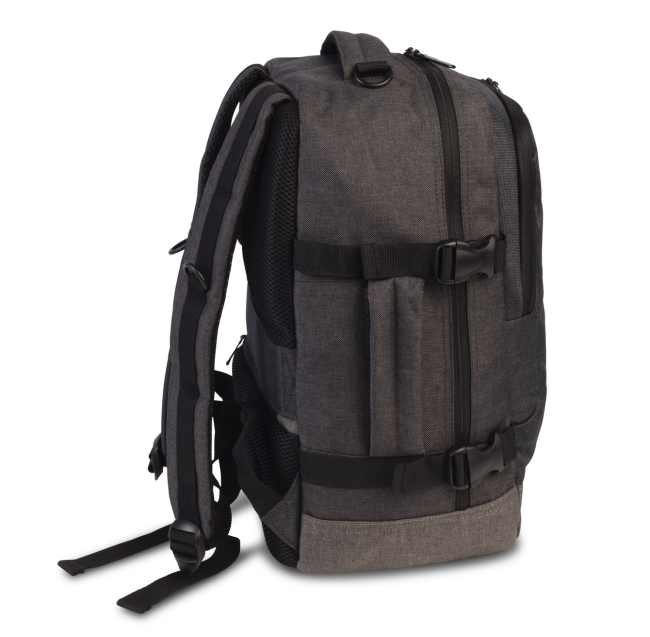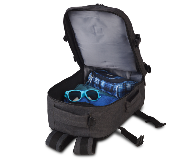 Tilava päälokero avautuu matkalaukkutyylisesti ja mahdollistaa vaatteiden siistin pakkaamisen henkselikiinnityksen avulla. Etutaskuun mahtuvat pieni kannettava tietokone tai tabletti, matka-asiakirjat sekä muita pieniä matkalla tarvittavia tavaroita kuten kuulokkeet, laturit yms.