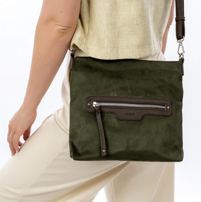 Emily & Noahin Drancy on kauniin tummanoliivi, vihreään kääntyvä, rennon tyylikäs olkalaukku. Siinä on ihanan pehmeäntuntuinen mokkajäljitelmä pinta, sekä hopeanväriset yksityiskohdat.