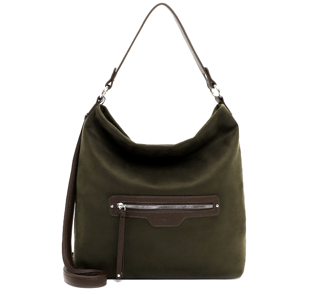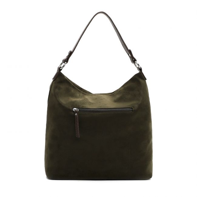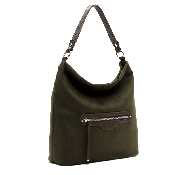 Emily & Noahin Drancy on kauniin tummanoliivi, vihreään kääntyvä olkalaukku, jossa kontrastina ruskeaa ja hopeanväristä metallia.