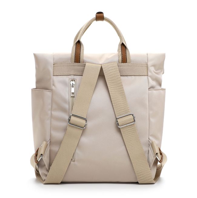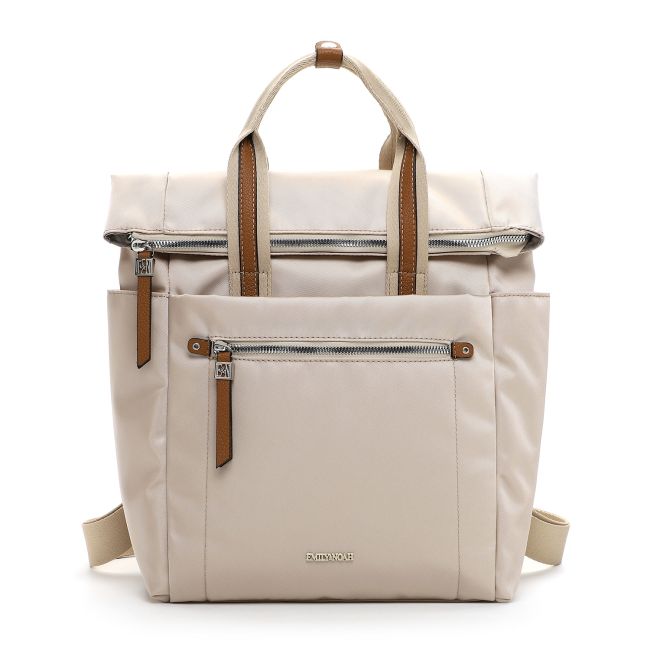 Emily & Noahin Esther on kevyt ja käytännöllinen vaaleanbeige cityreppu, jota koristaa konjakinruskeat yksityskohdat ja hopeanväriset vetoketjut.