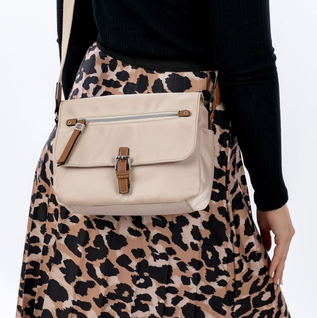 Laukku on vaaleanbeige, sen metalliset yksityiskohdat ovat hopeanvärisiä ja keinonahkaosiot konjakinruskeita.