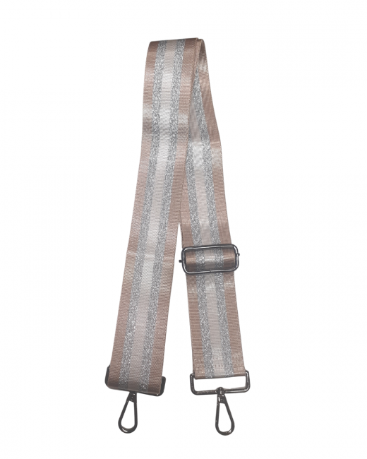 Enrico Benettin tekstiilinen olkahihna antaa laukullesi kauniin ilmeen. Hihnassa esiintyvät värit ovat taupe, vaaleanbeige ja kimallepintainen hopea. Metalliset soljet ovat tummansävyisiä.