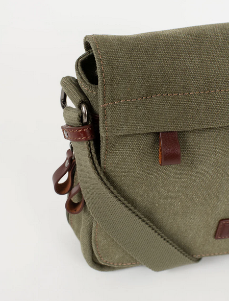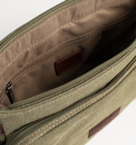 Fagolan canvaskankainen, khakinvihreä olkalaukku, jota koristaa ruskeat nahkaiset yksityiskohdat. Laukku sisältää monipuolisesti taskuja, joten tavarat saa lajiteltua kätevästi. Laukun olkahihna on säädettävä sekä laukkuun saa lisää tilaa avaamalla pohjassa olevan vetoketjullisen laajennusosan.