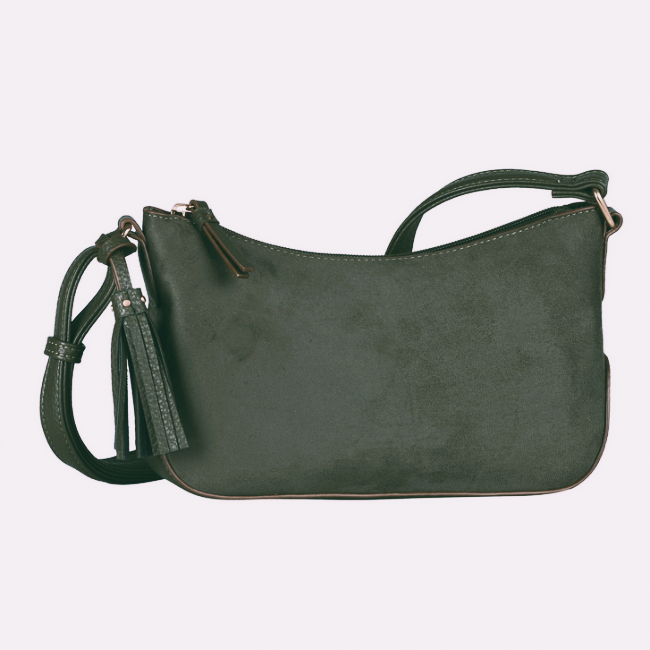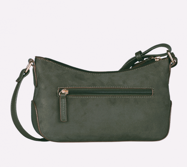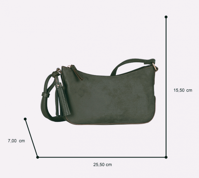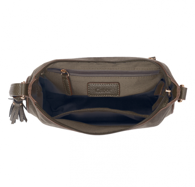Gaborin vihreässä Anthea-olkalaukussa on miellyttävän pehmeä mokkamainen pinta ja sen metalliset yksityiskohdat ovat tyylikkäät vaaleankullan väriset. Laukun pohja on ryhdikäs ja siinä on nahkajäljitelmästä valmistettu pohja, joka pitää laukun ryhdissään. Laukkuun mahtuu esimerkiksi puhelin, avaimet, lompakko, sekä muutama meikkituote. Laukkua koristaa laukkukoru, jonka voi halutessaan irrottaa.