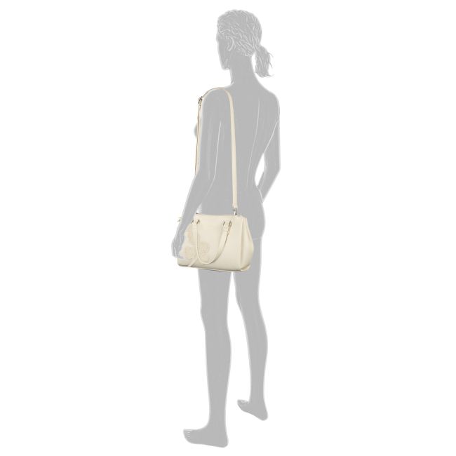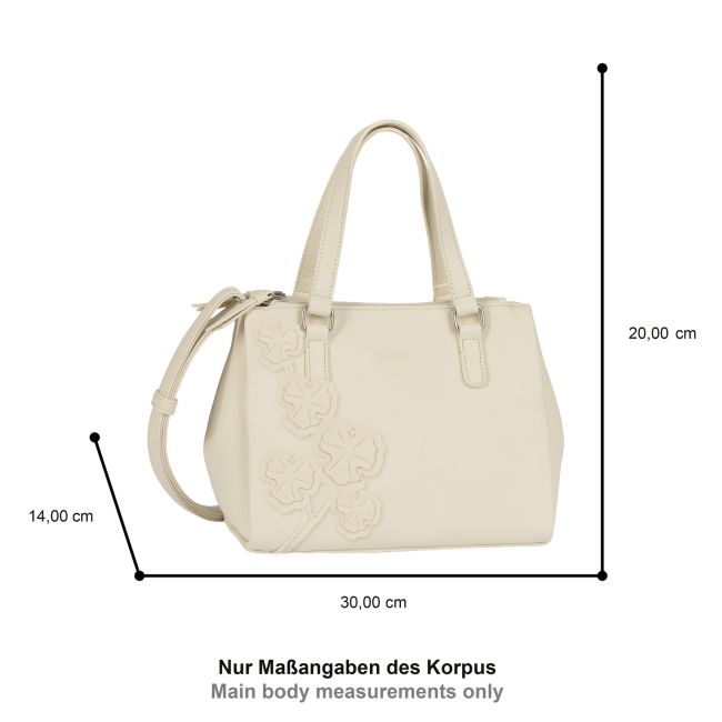 Gaborin Jovita on keskikokoinen luonnonvalkoinen käsilaukku, jonka katseenvangitsijana toimivat laukun pintaan kiinnitetyt upeat 3D-kukkaset.