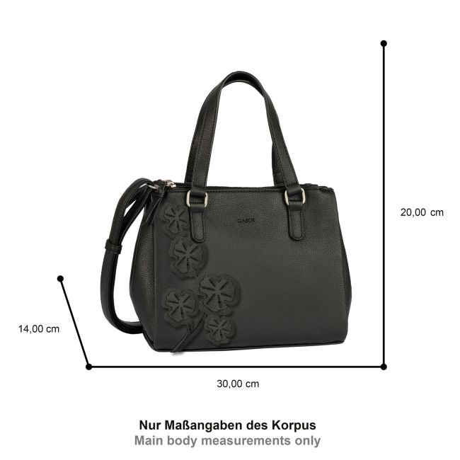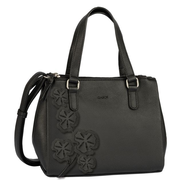 Gaborin Jovita on keskikokoinen musta käsilaukku, jonka katseenvangitsijana toimivat laukun pintaan kiinnitetyt upeat 3D-kukkaset.