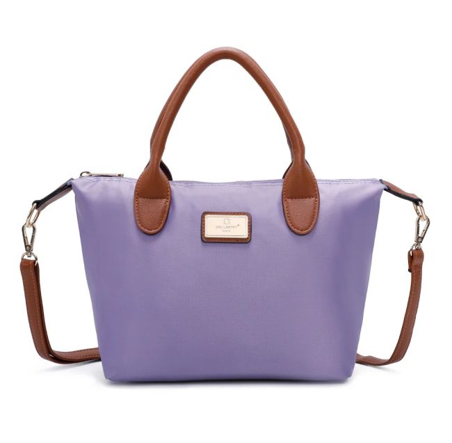 Galantryn La Balade on kevyt ja kaunis, lilanvärinen laukku arkeen. Laukun materiaali on hieman kiiltopintaista nylonia jota vasten konjakinruskeat, nahkajäljitelmästä valmistetut kahvat ja olkahihna luovat tyylikästä kontrastia. Laukun metalliset yksityiskohdat ovat kullanvärisiä.