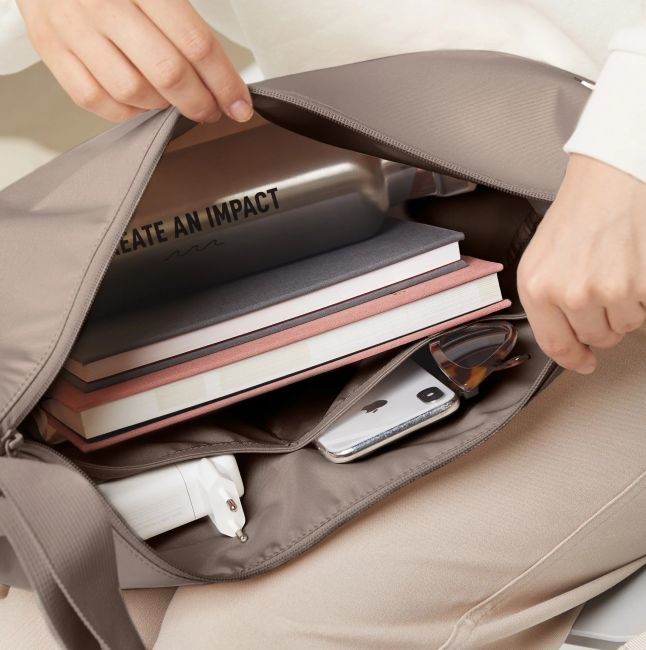Got Bagin suuri taupenvärinen Moon-laukku on muodikas olkalaukku arkeen. Laukussa on pitkä portaattomasti säädettävä olkahihna, joka mahdollistaa helpon kantotavan säädön. Laukkuun mahtuu paljon tavaraa, myös A4-kokoiset kirjat ja paperit.