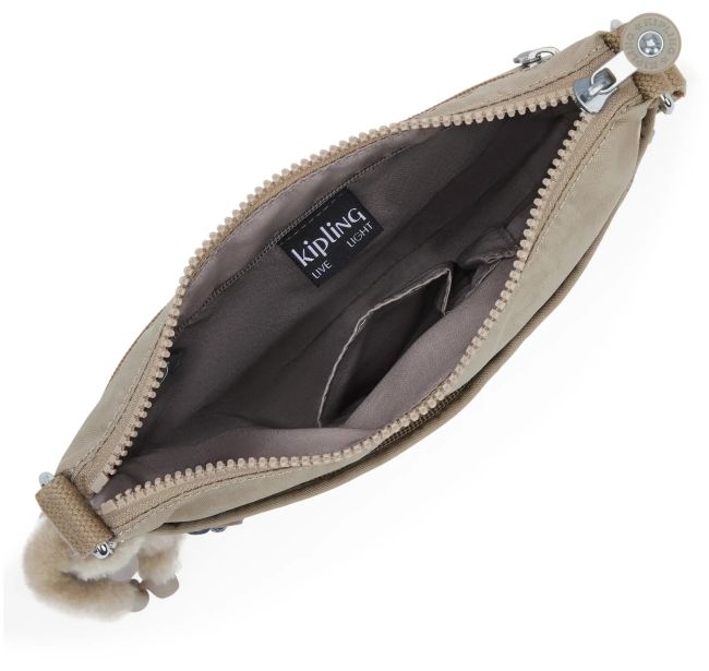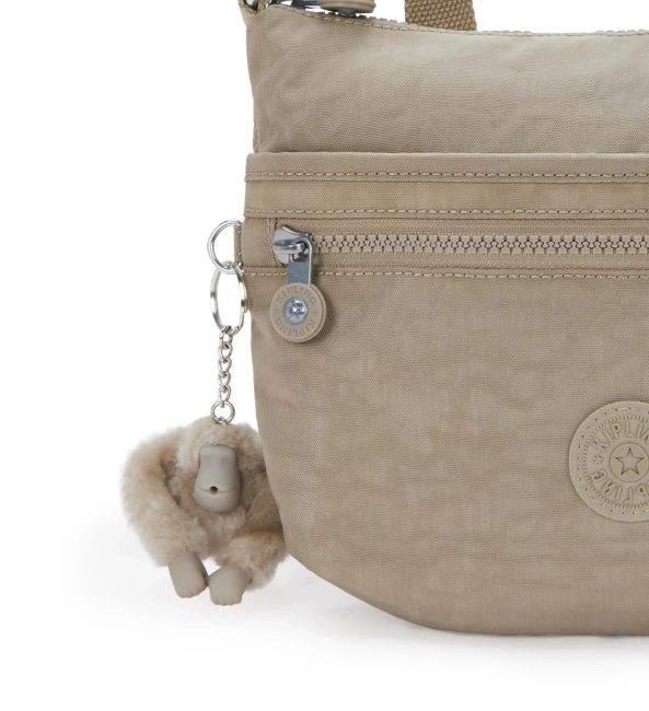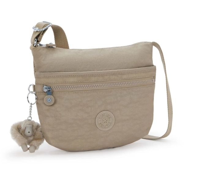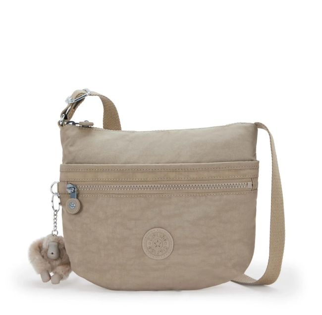 Kiplingin Arto S on käytännöllinen, kevyt ja laadukas, taupensävyinen olkalaukku. Laukussa on useita taskuja ja tilaa pienille perustarpeille.
