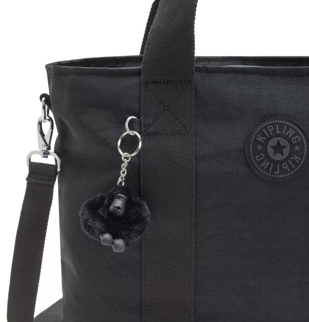 Laukussa on lyhyehköt kantokahvat ja irrotettava, haluaamasi mittaan säädettävä olkahihna ja mukana menossa roikkuu Kiplingin ikoninen, karvainen apinamaskotti.