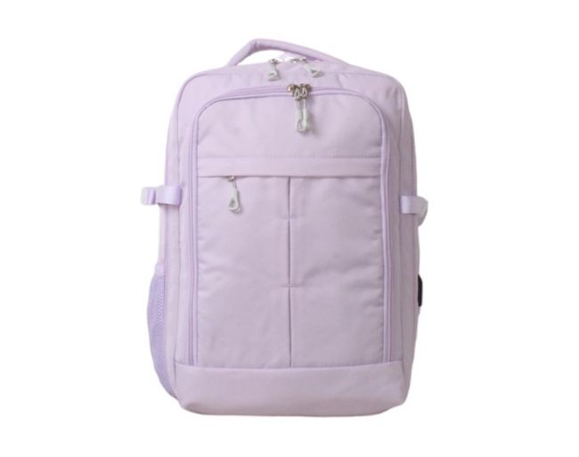 Mia Larougen vaaleanlila matkareppu soveltuu matkakumppaniksi monenlaisiin reissuihin. Se mahtuu useiden lentoyhtiöiden käsimatkatavaramittoihin. Reppu käy kokonsa puolesta esimerkiksi Wizz Airin lennoilla penkin alle sijoitettavaksi matkatavaraksi.