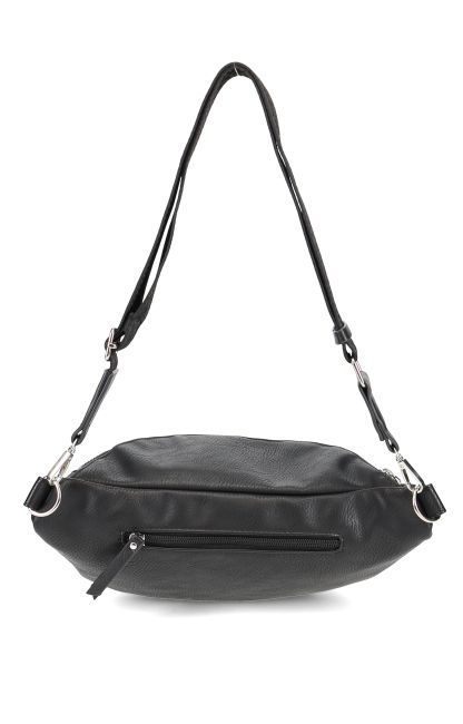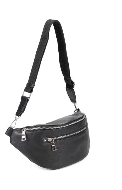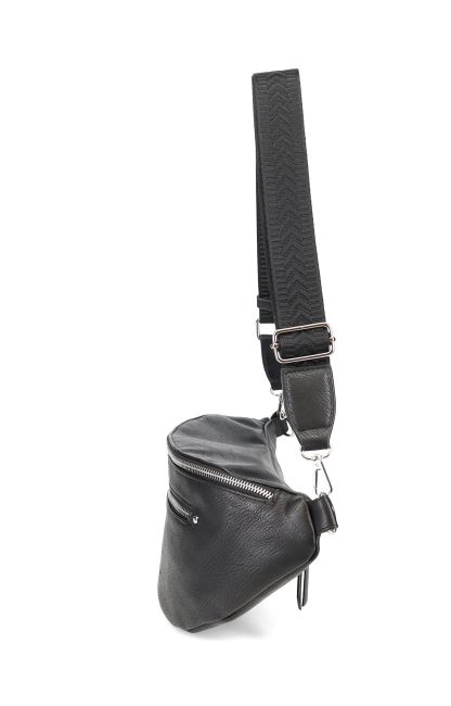 Migantin musta, vyölaukkumaisen ulkonäön omaava crossbodylaukku jonka metalliset yksityiskohdat ovat hopeanvärisiä. Laukussa on säädettävä olkahihna, jonka maksimipituus on solkineen noin 115 cm.