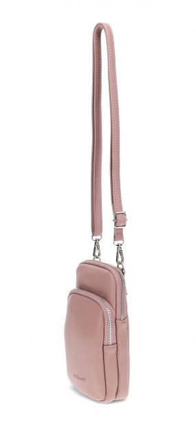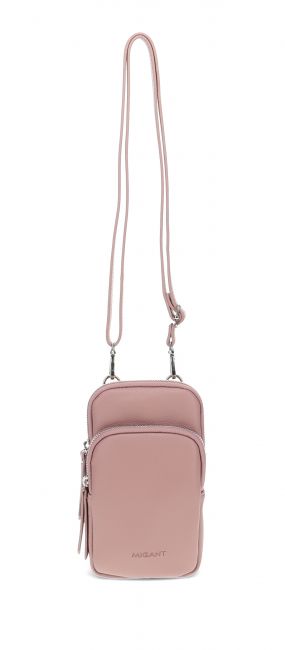Migantin tummanlilansävyinen kännykkälaukku. Laukkuun mahtuu esimerkiksi n. 17 x 9 cm kokoinen puhelin, pieni lompakko, avaimet ja huulipuna.