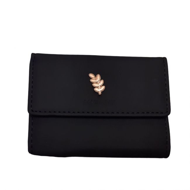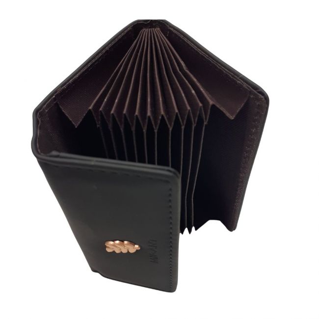 Migantin pehmeäpintainen musta nepparilla suljettava korttilompakko. Edessä kullan värinen lehden muotoinen koristeyksityiskohta. Sisällä haitaitarimaisesti avautuvat lokerot, joista yhdeksän kapeampia avoimia lokeroita sekä kaksi suurempaa avointa lokeroa.