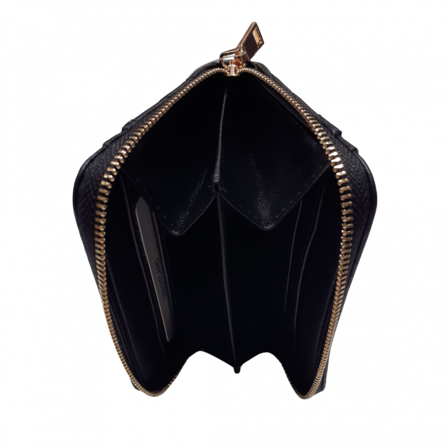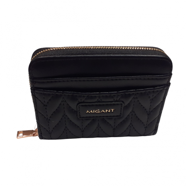 Migantin musta pehmeäpintainen korttilompakko. Lompakossa on samalla sekä käytännöllinen että kaunis muotoilu: Kullanvärinen vetoketju, sekä edessä että takana kaunis leikkaus ja tikattu pintakuvio. Hyvät tilaratkaisut pitävät kortit ja kuitit ym hyvässä järjestyksessä.