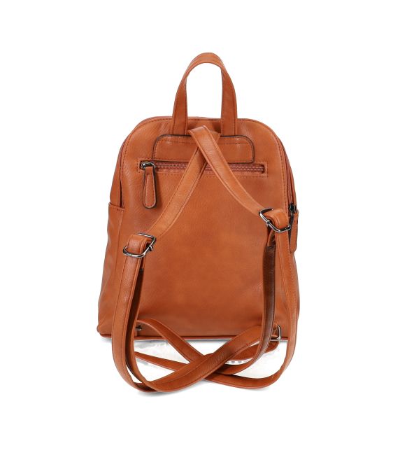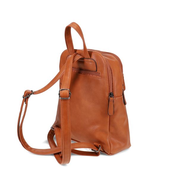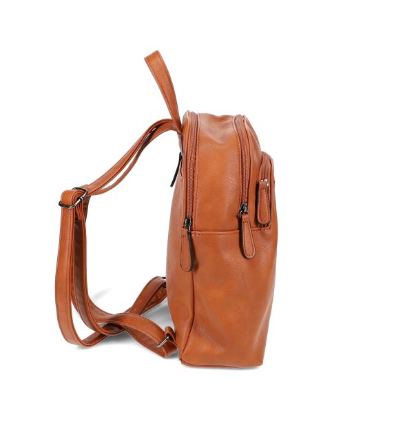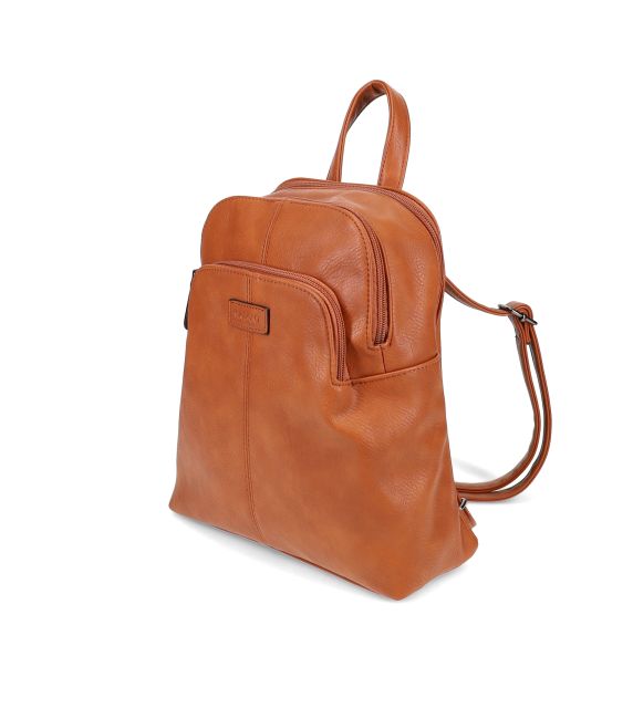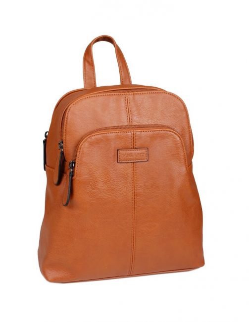 Migantin konjakinruskea cityreppu. Reppu on pehmeäntuntuinen, mutta pysyy ryhdissään tyhjänäkin. Reppu on käytännöllinen, siinä on useita taskuja tavaroiden järjestelyyn ja sinne mahtuu perustarpeet hyvin.