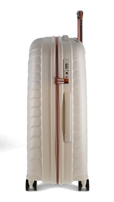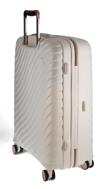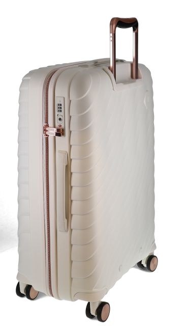 Tämä Migantin keskisuuri matkalaukku on katseenkääntävän kaunis. Siinä on valkoinen pinta hienolla muotoilulla ja ruusukullanväriset yksityiskohdat vetoaisassa, vetoketjussa ja rengaskapseleissa.