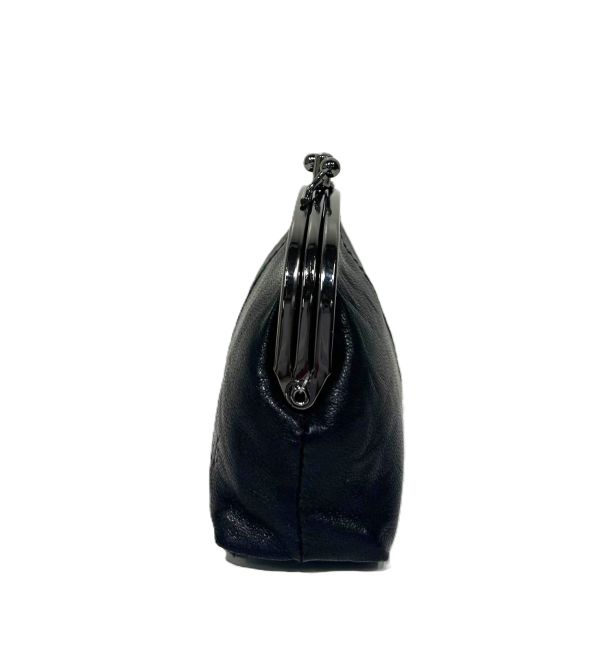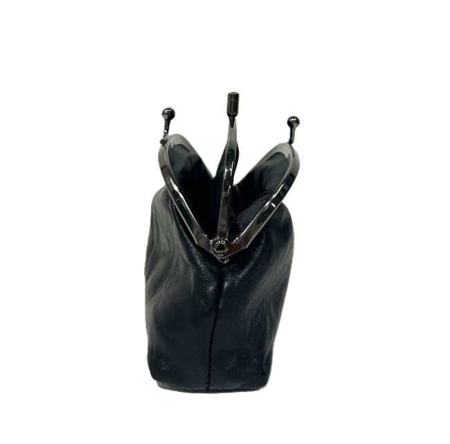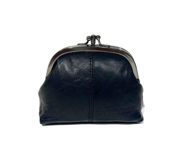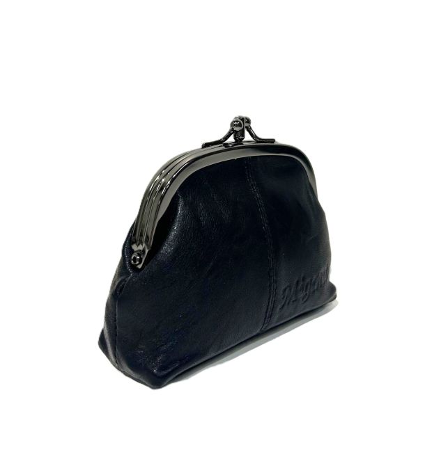 Migantin musta, pehmeästä aidosta nahasta valmistettu kukkaro, jossa kaksi erillista metalliklipsillä suljettavaa osastoa. Tilavaan nahkakukkaroon mahtuu hyvin käteistä ja maksukortteja. Kukkaro kulkee kätevästi mukana taskussa tai laukussa.