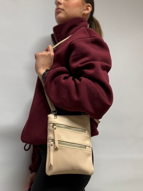 Migantin beigeen olkalaukkuun mahtuvat pienimmät perustarpeet kuten puhelin (max. korkeus n. 18 cm), avaimet, huulipuna ja maksukortit. Laukku soveltuukin hyvin kännykkälaukuksi. Laukun beige sävy sopii hyvin myös nudenvärisiin kenkiin yhdistettynä.