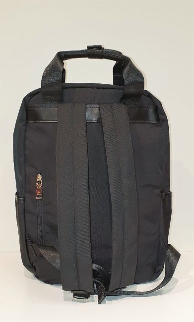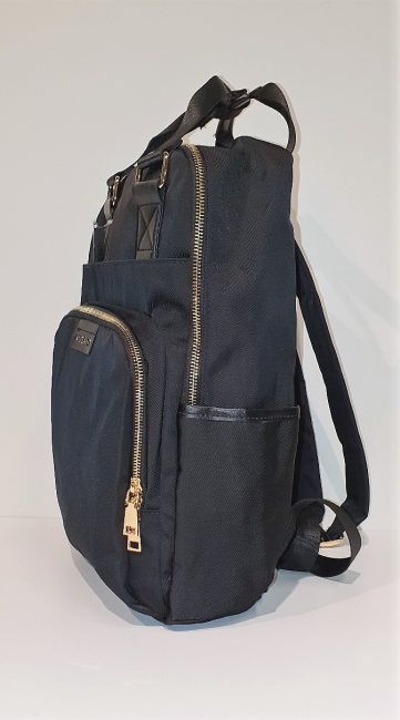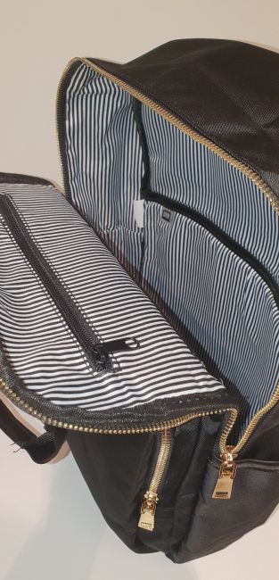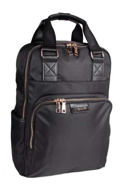 Tyylikäs Migantin musta reppu sopii niin kaupunkikäyttöön kuin töihin ja kouluunkin. Reppua koristavat kullanväriset yksityiskohdat vetoketjuissa, napissa ja soljissa. Repun tekstiili on liukaspintaista, satiinisen tuntuista. Kantokahvoissa on keinonahkaiset yksityiskohdat. Tässä mustassa repussa on mustavalkoraitainen sisävuori.