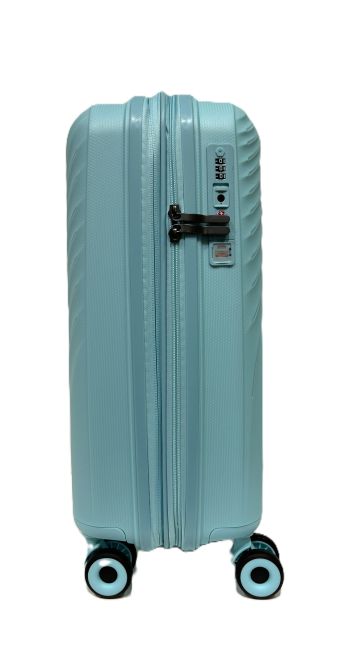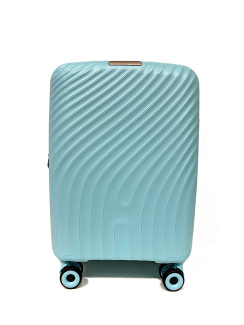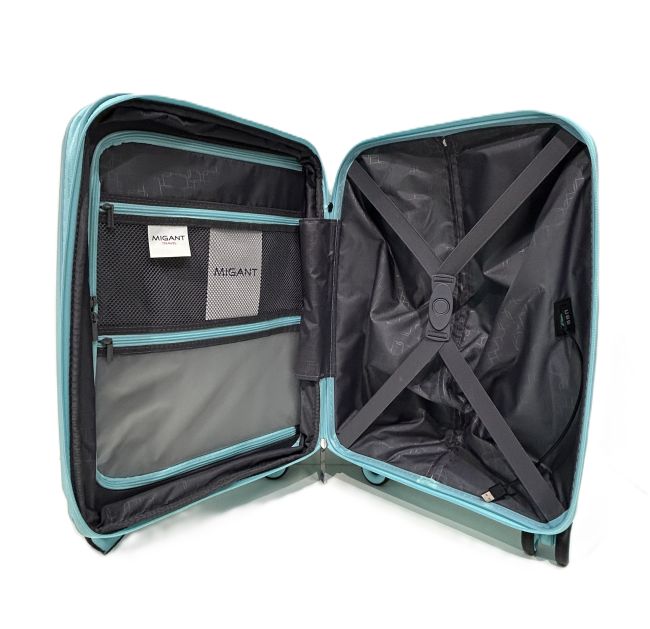 Migantin kaunis, raikkaan vaaleansininen, polypropyleenista valmistettu lentolaukku, joka on kevyt, neljän tuplapyörän ansiosta käytännöllinen ja helposti vierellä rullaava matkakumppani.