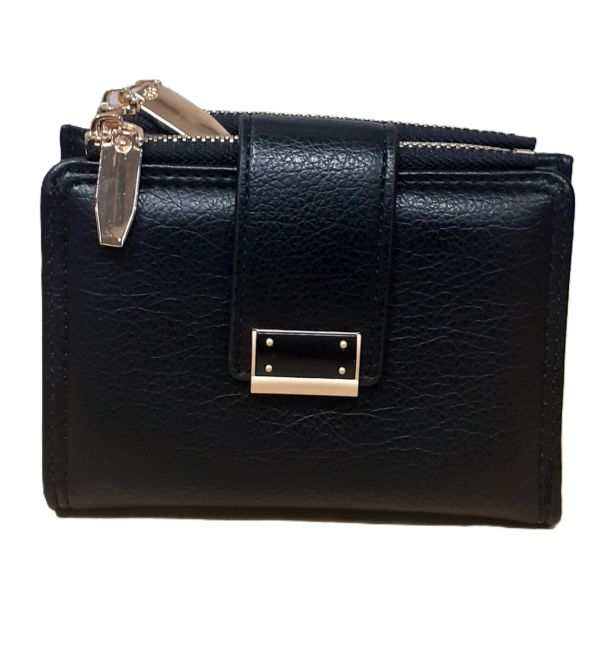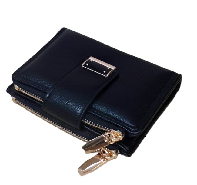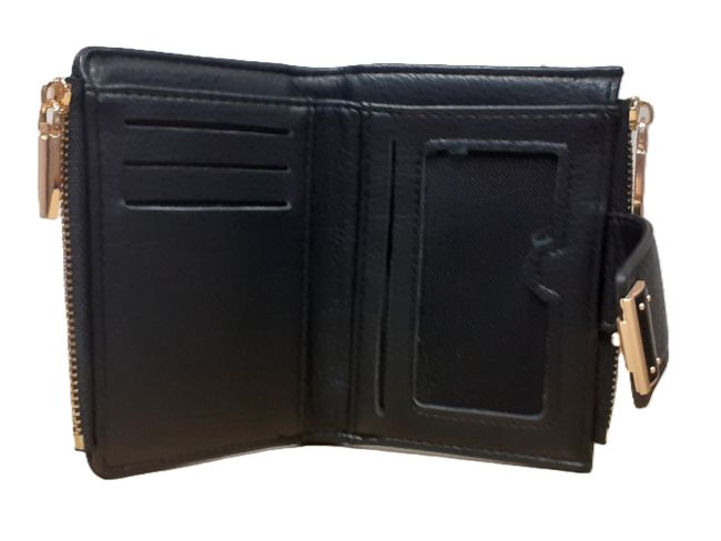 Lompakko on väriltään musta ja sen metalliset yksityiskohdat ovat kullansävyisiä.