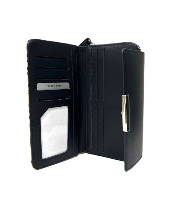 Nabon kaunis, leopardikuosinen lompakko. Lompakko on isokokoinen ja sen taskuihin mahtuu järjestellä kortit, käteinen ja kuitit. Lompakon metalliset yksityiskohdat ovat hopeanvärisiä.