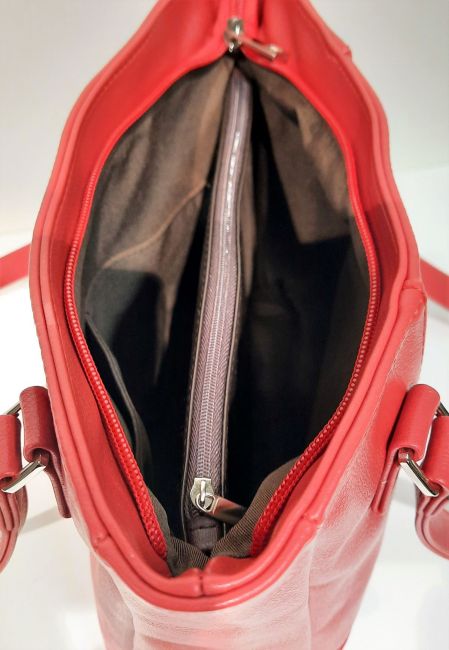 Nabon klassisen tyylikäs, punainen olkalaukku. Laukku on ryhdikäs ja käytännöllinen kokonsa ja monipuolisten taskujen ansiosta. Laukun keskellä on vetoketjullinen tilanjakaja, joten tavarat saa kätevästi jaoteltua omiin lokeroihinsa. Laukun pitkähköt olkahihnat ulottuvat hyvin olalle.