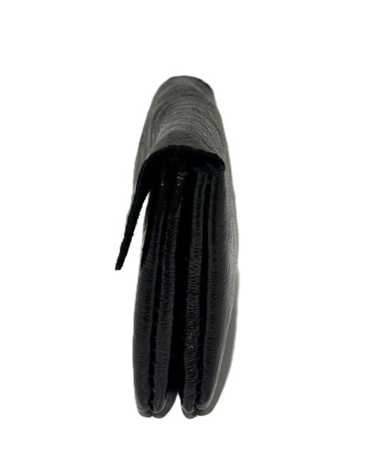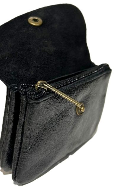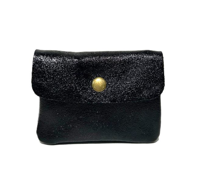 Metallinhohtoista mustaa nahkaa oleva pieni kukkaro on näppärän kokoinen kun tarvitset mukaasi vain jokusen maksukortin, taitetun setelin ja kolikoita. Nepparikiinnitys pitää kukkaron suljettuna, ja sisällä on kaksi avotaskua sekä vetoketjullinen lokero kolikoille. Kukkaro mahtuu hyvin laukkuun tai taskuun.