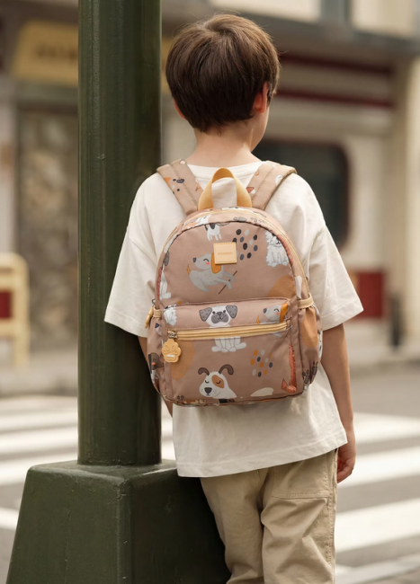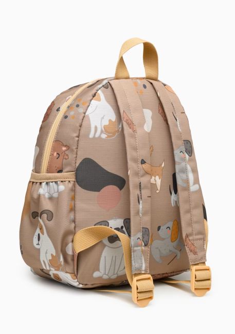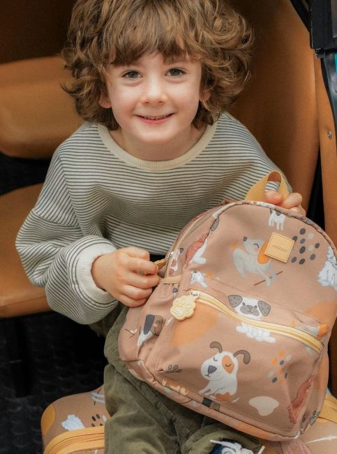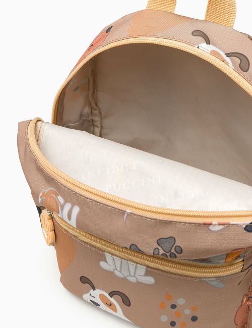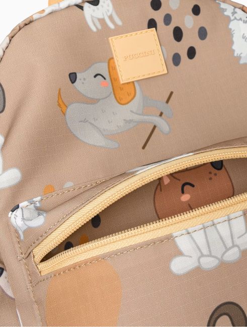 Puccinin ihastuttava, vaaleanruskea, koirakuvioinen kerhoreppu perheen pienimmille. Lapsen omat perustarpeet mahtuvat hyvin mukaan tähän suloiseen matkakumppaniin.