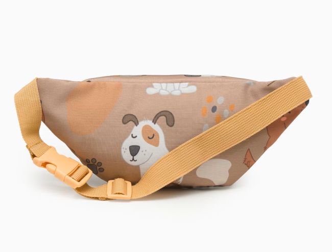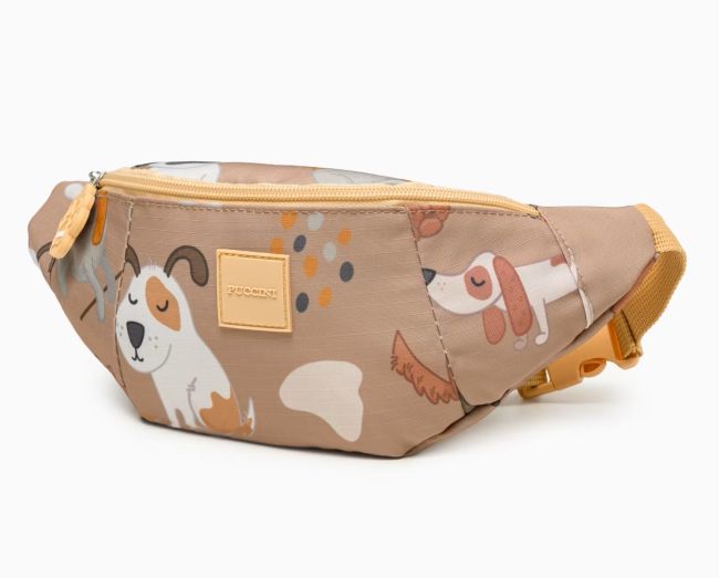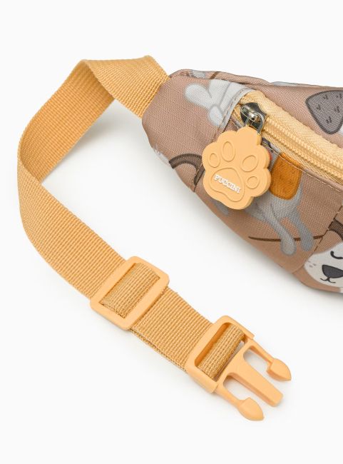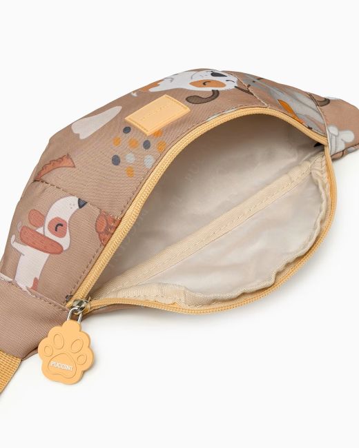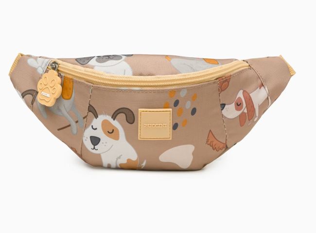 Puccinin ihastuttava, vaaleanruskea, yksisarvisilla kuvioitu vyölaukku perheen pienimmille. Vetoketjussa eläimen tassun muotoinen vetäjä.