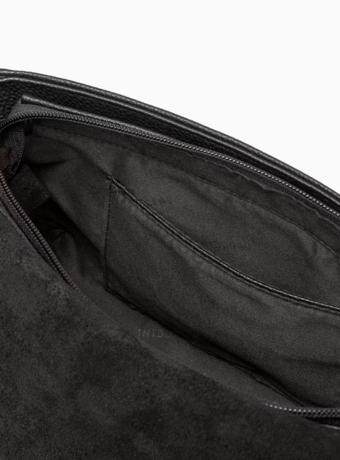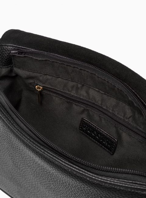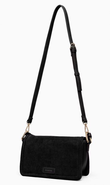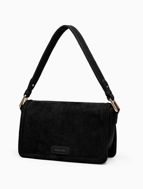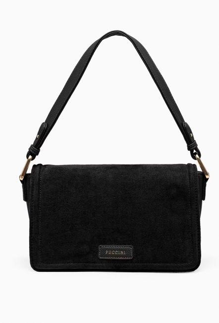 PUCCINI Fashion Collectionin musta olkalaukku on monikäyttöinen, käytännöllinen ja tyylikäs. Kompaktin kokoinen laukku yhdistää kaksi korkealaatuista materiaalia: keinomokan ja keinonahan.