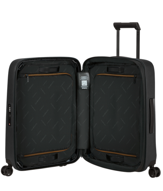 Samsoniten tyylikäs, vetoketjulla suljettava Essens-lentolaukku on valmistettu Euroopassa käyttäen kierrätettyjä materiaaleja. Lentolaukussa on 3-pistelukitus TSA-numerolukolla, hiljaiset, tärinää hillitsevät tuplapyörät ja laajennusosa.