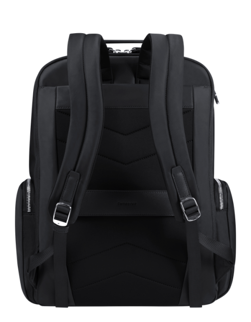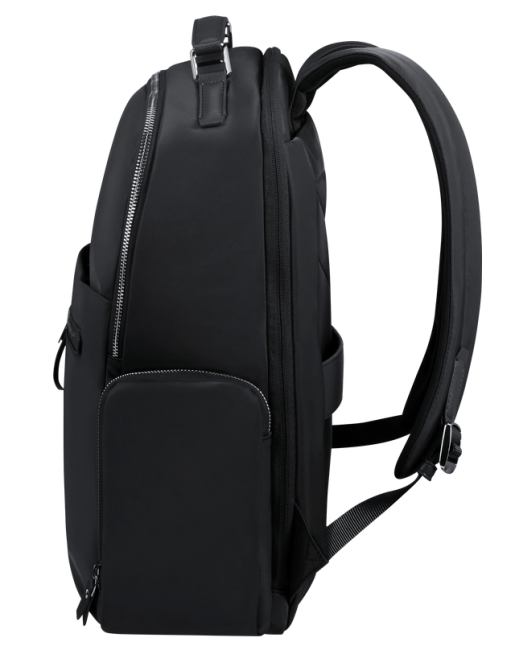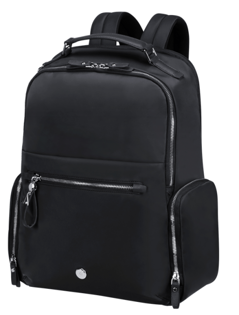 Samsoniten Karissa Evo on kaunis, hienostuneen ilmeen omaava naisellinen reppu jossa on liukaspintainen musta kangas ja sekä metallisia, hopeanvärisiä että mustia keinonahkaisia yksityiskohtia.