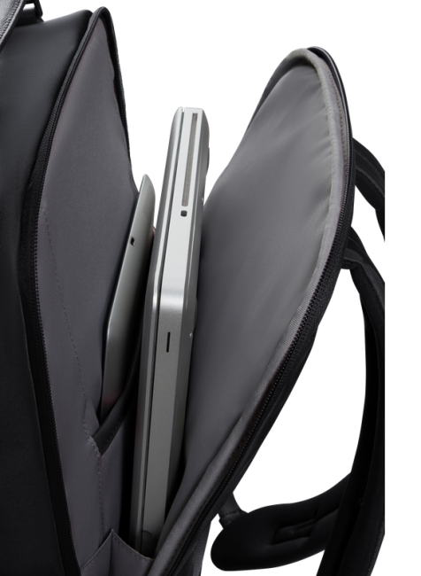 Repun olkaimet ovat pehmustetut ja repun saa smart sleeven avulla kiinnitettyä matkalaukkuun.
