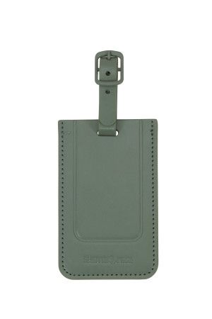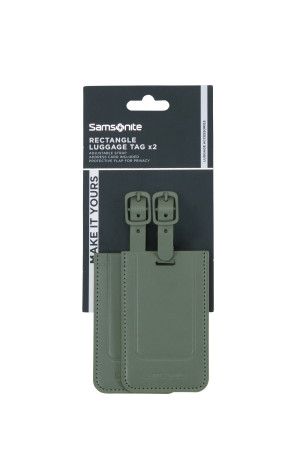 Samsoniten kohokuvioidulla logolla varustettu vihreä osoitelappu esimerkiksi matkalaukun nimikointiin. Paketissa on kaksi samanlaista osoitelappua.