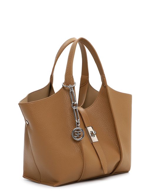 Suri Freyn hiekanvärinen, persoonallisesti muotoiltu, kaunis käsilaukku, jota koristaa hopeanvärinen laukkukoru.