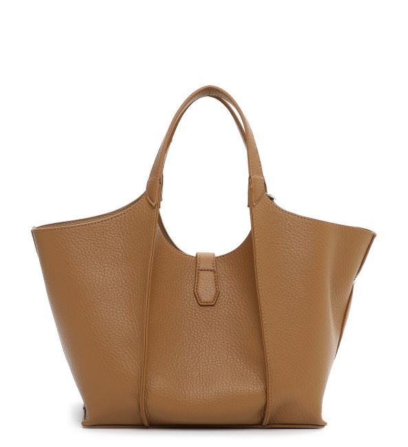 Taskut: Laukun päällä on remmi, joka suljetaan käännettävälllä soljella. Muuten avonaisessa laukussa on kiinni ommeltuna pussukkamainen, vetoketjulla suljettava sisus jonka sisällä on vetoketjullinen tasku ja avotasku. Pussukan molemmille puolille jää avonaista säilytystilaa.