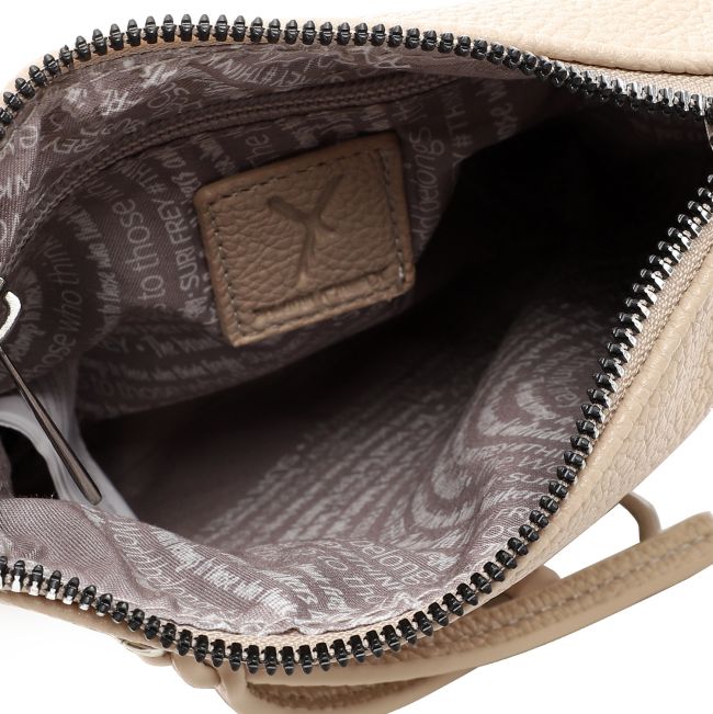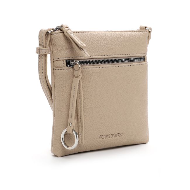 Suri Freyn Debby on beigensävyinen olkalaukku jonne mahtuu pienet perustarpeet kuten kännykkä, pieni lompakko, aurinkolasikotelo, huulipuna ja avaimet.