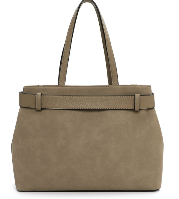 Laukkua koristaa sitä ympäröivä vyö. Huom! Laukussa ei ole kuvassa näkyvää metallista yksityiskohtaa, joka roikkuu vyön päässä.