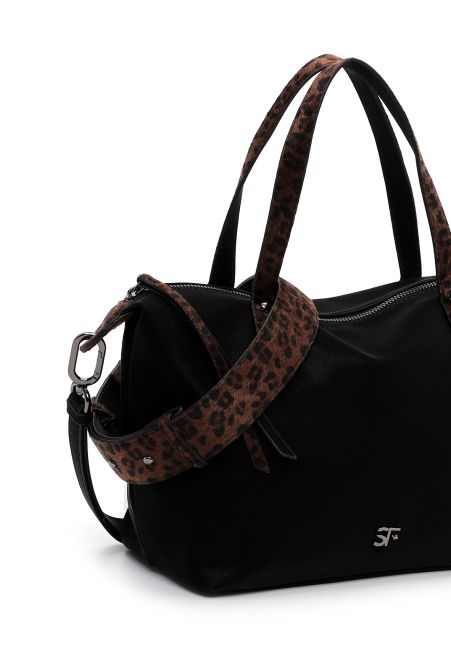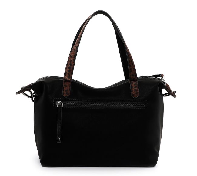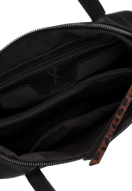 Tässä käsilaukussa on mukana myös kaksi erilaista olkahihnaa. Leopardikuosinen on kolmen reiän verran säädettävissä ja kapeampi musta hihna on porttaattomasti haluttuun mittaan säädettävä. Molemmat hihnat ovat myös laukusta irrotettavissa. Laukun ilmettä ja kantotapaa on siis helppo muutella halutun mukaiseksi.