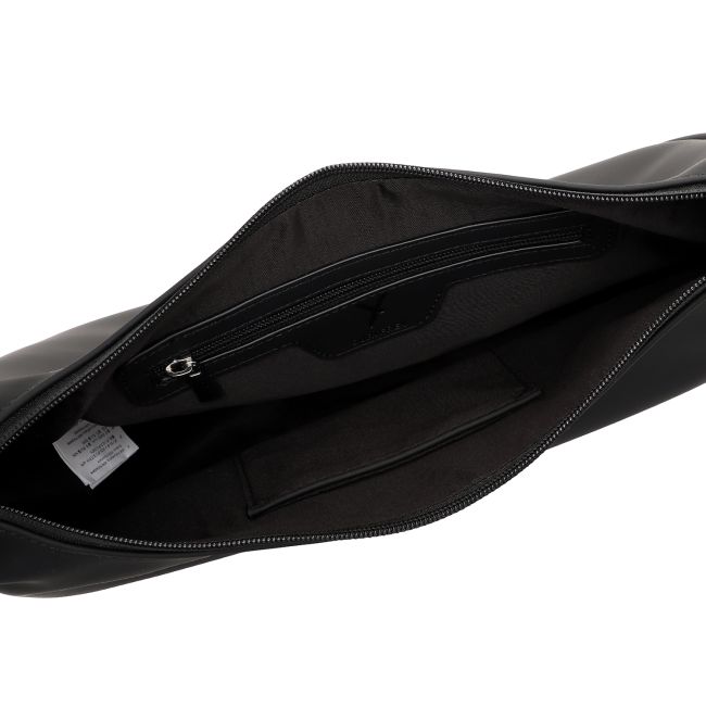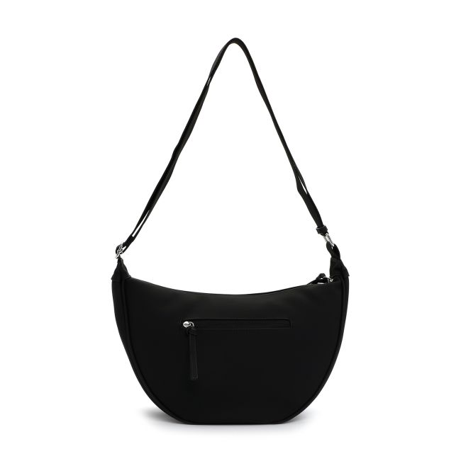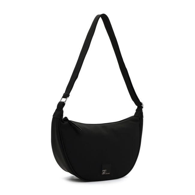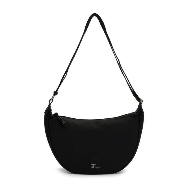 Suri Freyn muodikas musta moon-olkalaukku. Tilavaan laukkuun mahtuu hyvin kaikki perustarpeet ja tarvittaessa myös A5-kokoinen kalenteri tai lehtiö. Laukussa on pitkä portaattomasti säädettävä olkahihna, joka mahdollistaa helpon kantotavan säädön. Laukun materiaali on vettähylkivää, joten sitä voi käyttää kelissä kuin kelissä.