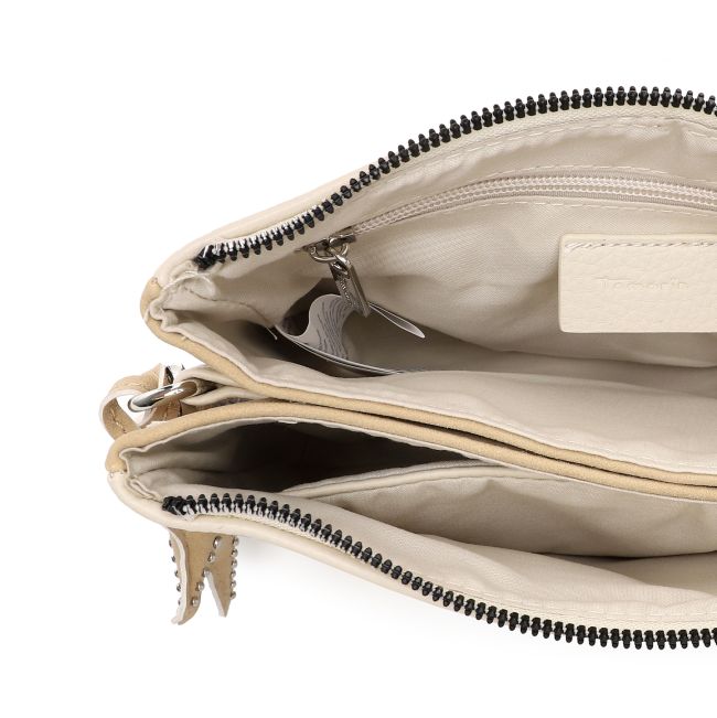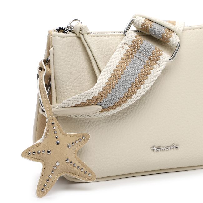 Tamariksen vaaleanbeigessä olkalaukussa on muodikas leveä olkahihna, jossa beigejä, taupeja ja harmaita raitoja. Vetoketjulla suljettava laukku on jaettu kahteen erilliseen osioon, joiden välissä tilaa jakava väliseinä. Laukkuun mahtuu tärkeimmät perustarpeet kuten puhelin, lompakko, aurinkolasikotelo ja avaimet.