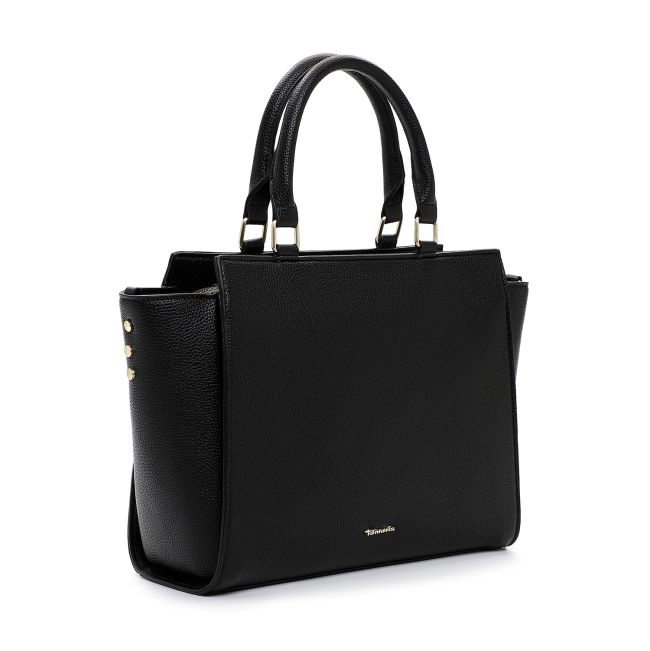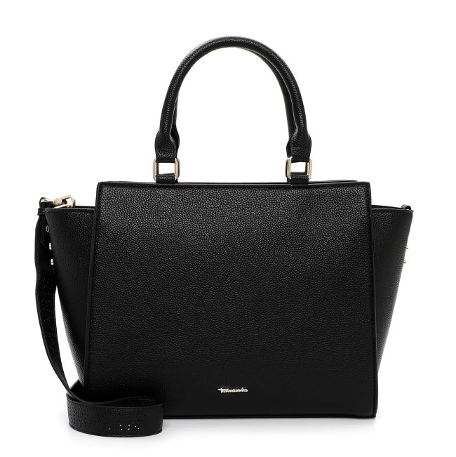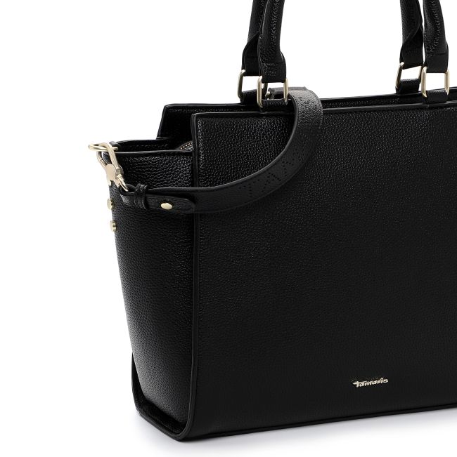 Laukussa on käsilaukulle ominaiset lyhyet kantokahvat ja leveä, säädettävissä oleva olkahihna jonka pinnassa toistuu reikäkuviointina sana Tamaris.