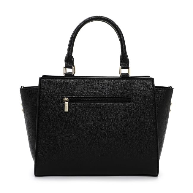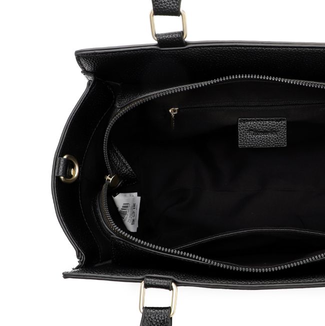 Tämän mustan laukun metalliset yksityiskohdat ovat vaaleasti kullansävyisiä.