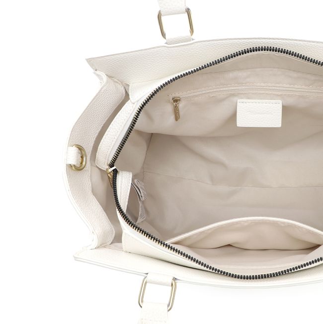Tämän raikkaan valkoisen laukun metalliset yksityiskohdat ovat vaaleasti kullansävyisiä.