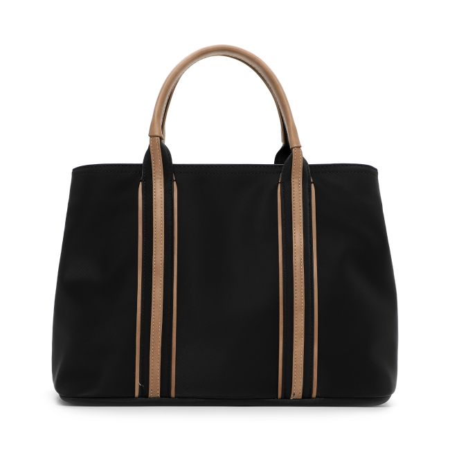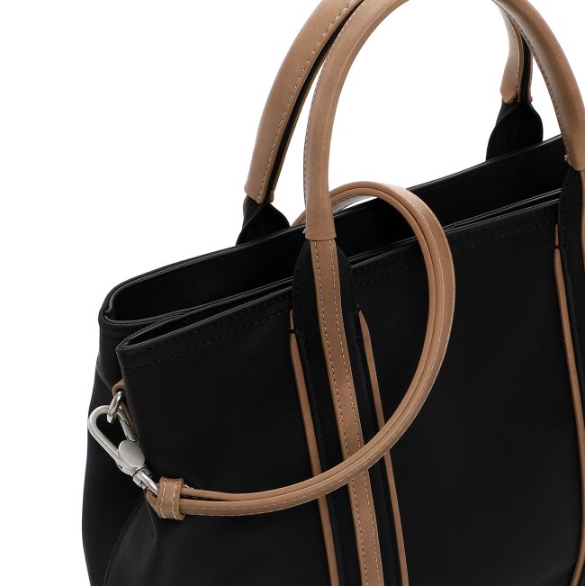 Laukun pääväri on musta ja sitä elävöittää vaaleanruskeat yksityiskohdat. Laukun materiaalin pinta on hieman kumimaisen tuntuista ja ihanan pehmeää, mutta laukku säilyttää ryhtinsä myös tyhjänä.