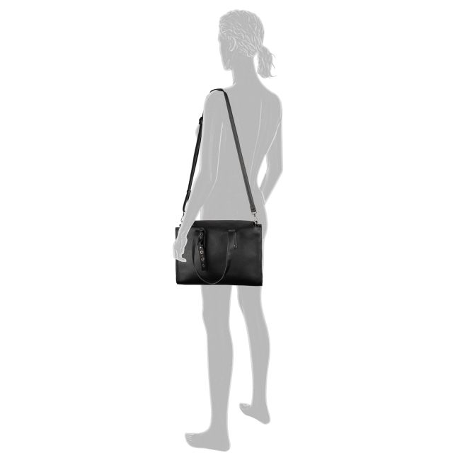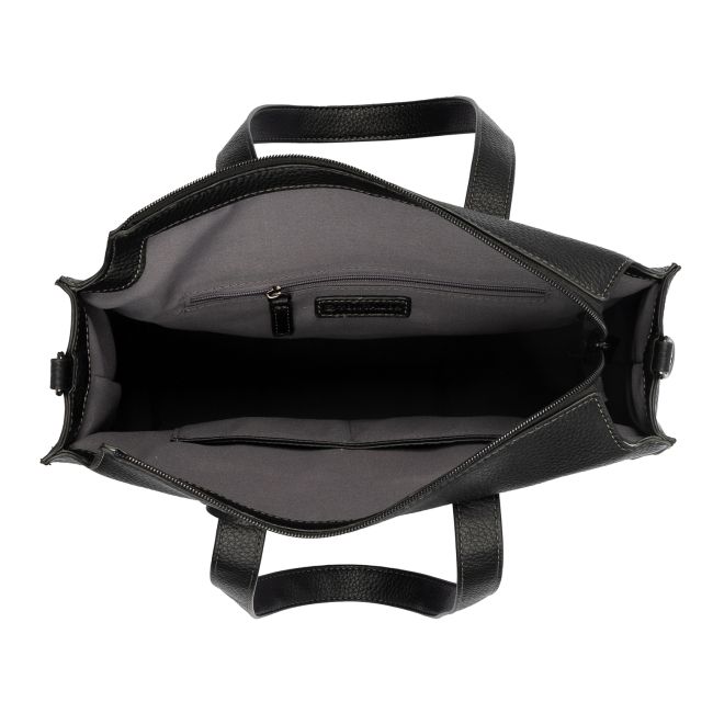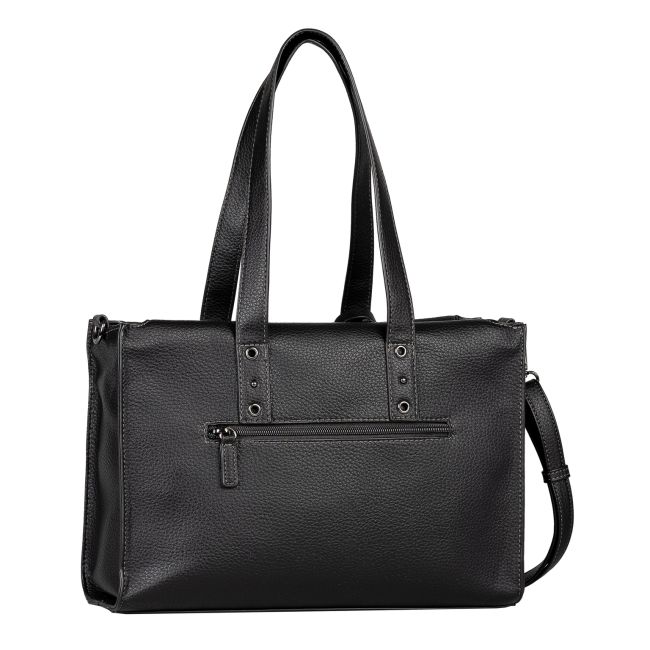 Tom Tailorin Elaria on keskikokoinen musta shopperlaukku. Laukku soveltuu hyvin esim. opiskelu- tai työkäyttöön, sillä siihen mahtuu A4-kokoiset paperit suorina. Laukun takana on vetoketjutasku, jossa voi kätevästi säilyttää vaikka avaimia.